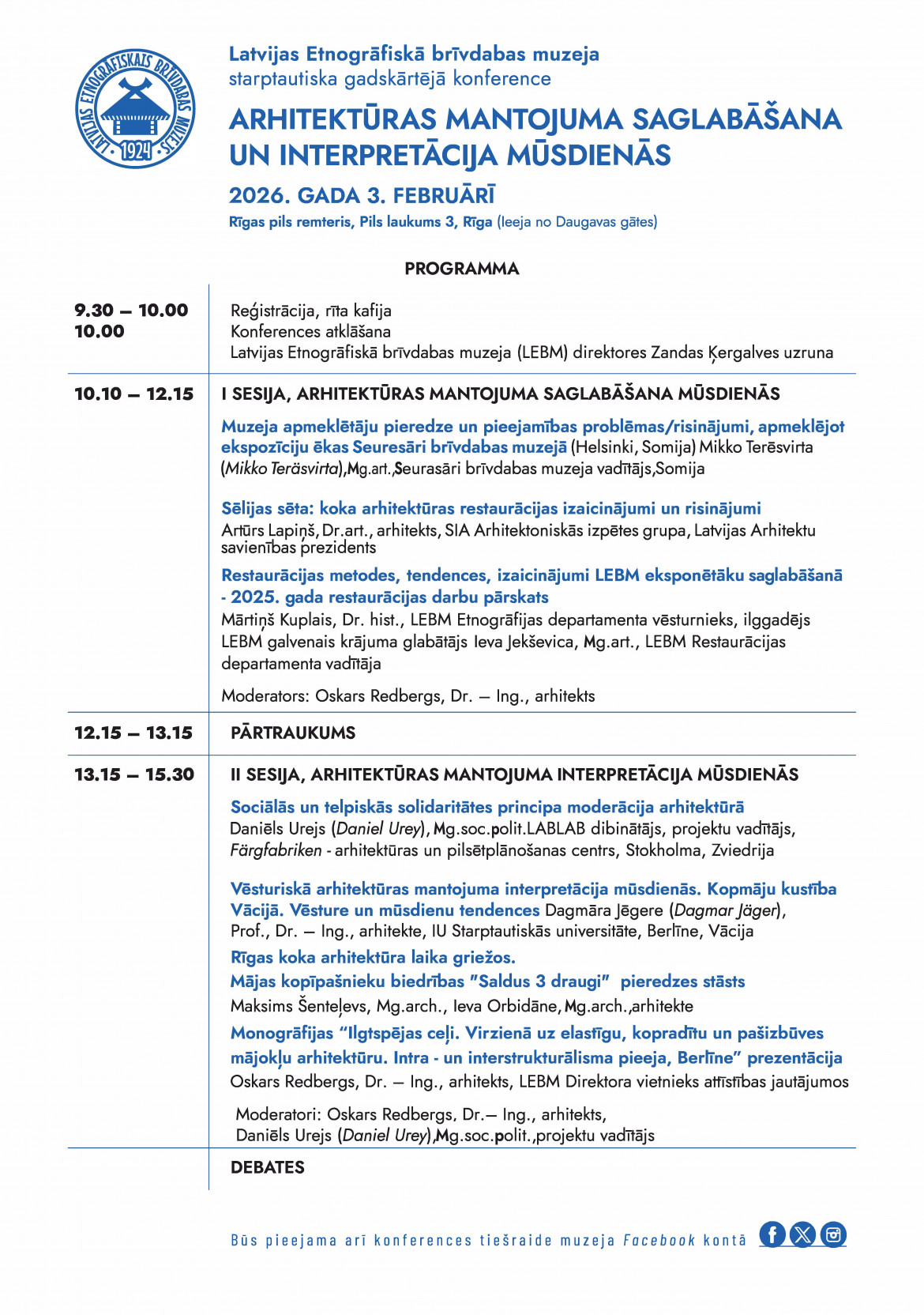 Konferences pirmajā daļā, kas veltīta arhitektūras mantojuma saglabāšanai, Somijas Seurasāri brīvdabas muzeja pakalpojumu vadītājs Mikko Terēsvirta ( Mikko Teräsvirta) iepazīstinās ar muzeja apmeklētāju pieredzi un pieejamības risinājumiem Seurasāri muzejā. Savukārt arhitekts Dr. art. Artūrs Lapiņš stāstīs par Latvijas Etnogrāfiskajā brīvdabas muzejā plānotās Sēlijas sētas izveides izaicinājumiem un risinājumiem.